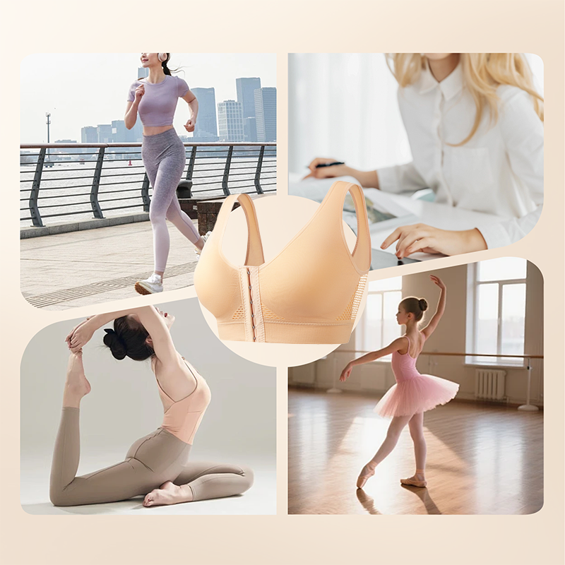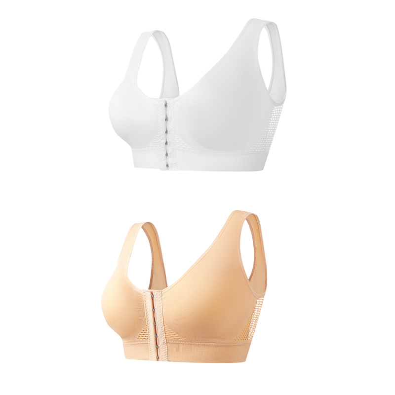 ŁATWE ZAPIĘCIE Z PRZODU: Dopasuj biustonosz w kilka sekund dzięki sprytnemu systemowi zapięcia z przodu. Trzy rzędy haftek pozwalają regulować obwód w zależności od potrzeb w ciągu dnia, a zakładanie i zdejmowanie jest proste, bez uciążliwego zapięcia na plecach.