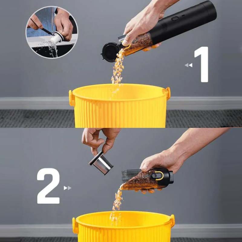 Silna moc ssania:Wyposażony w potężny silnik, który zapewnia wyjątkowe ssanie do szybkiego i skutecznego usuwania brudu i zanieczyszczeń z wnętrza samochodu.