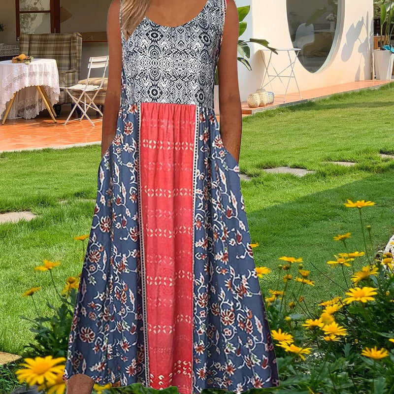 DŁUGA SUKIENKA BEZ RĘKAWÓW: Zaprojektowana bez rękawów i z lejącą długą spódnicą, ta sukienka zapewnia komfort i przewiewność w ciepłe dni, oferując jednocześnie swobodny i stylowy wygląd.