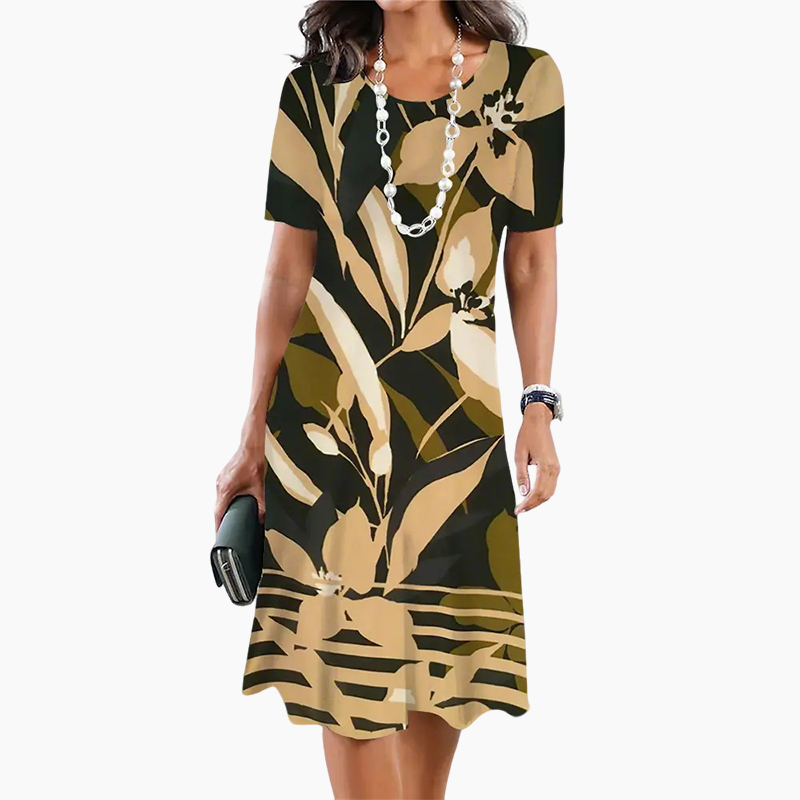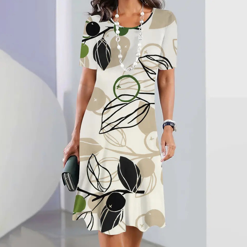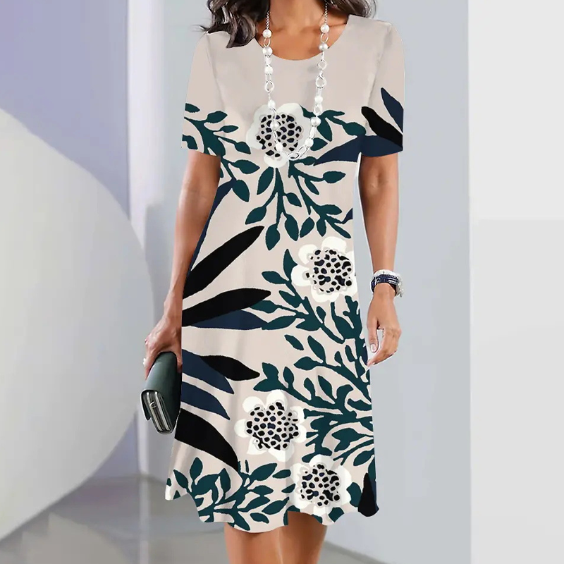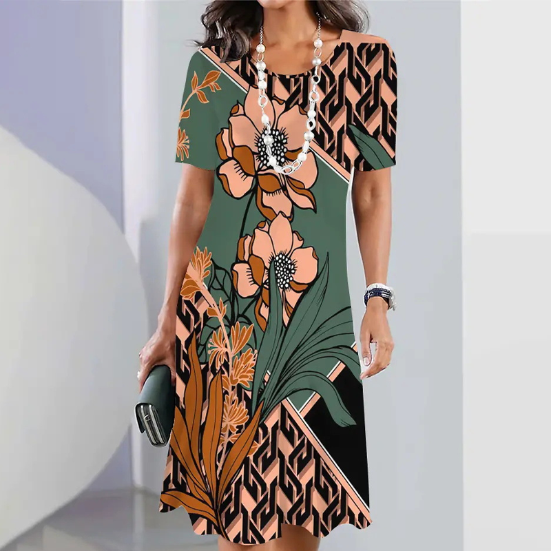 Zawartość zestawu: 1× Damska sukienka midi z nadrukiem i okrągłym dekoltem