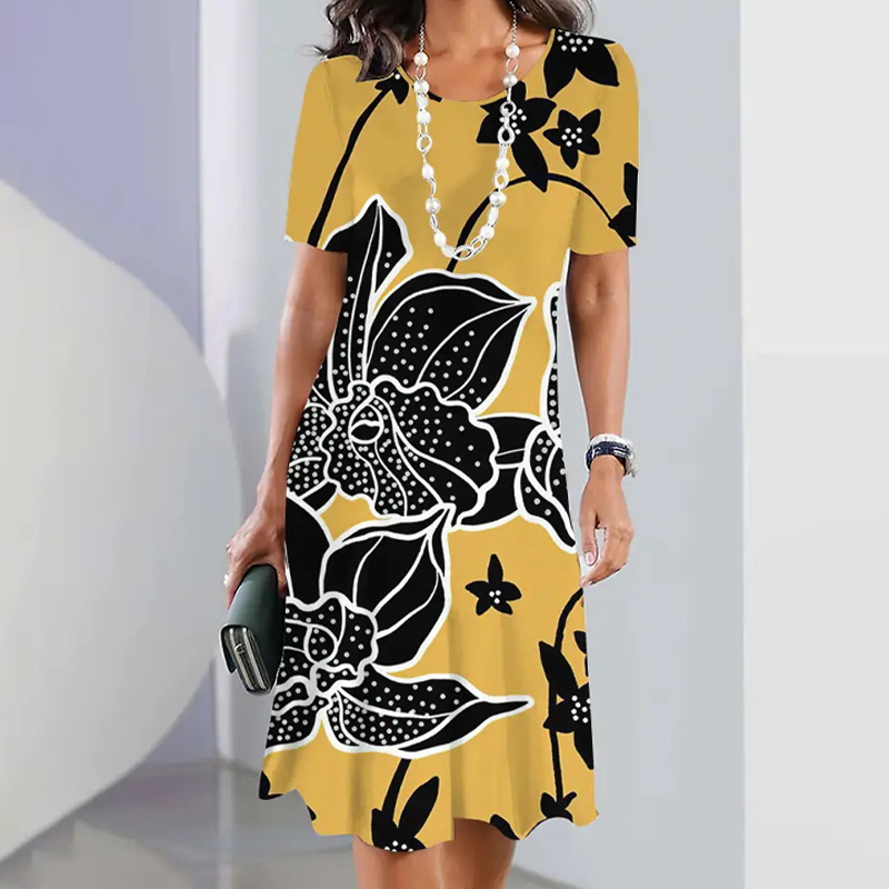 👗 ELEGANCKI WZÓR – Damska sukienka midi z okrągłym dekoltem wyróżnia się subtelnym, przyciągającym wzrok kwiatowym nadrukiem, który dodaje klasy i kobiecego uroku. Prosty dekolt idealnie współgra z całością, tworząc stylowy i swobodny wygląd.