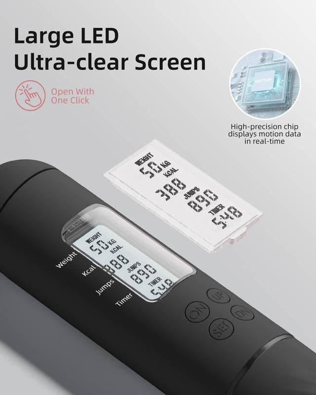- Dzięki wbudowanemu precyzyjnemu licznikowi, który dokładnie zlicza liczbę skoków i oblicza liczbę spalonych kalorii podczas całego procesu, dane generowane podczas ćwiczeń są bardziej zrozumiałe niż fizyczne liczenie.