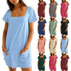💕Sukienka mini z krótkim rękawem i kieszeniami, kwadratowy dekolt, długość mini, luźny krój, łatwa do ubierania na górę i na dół