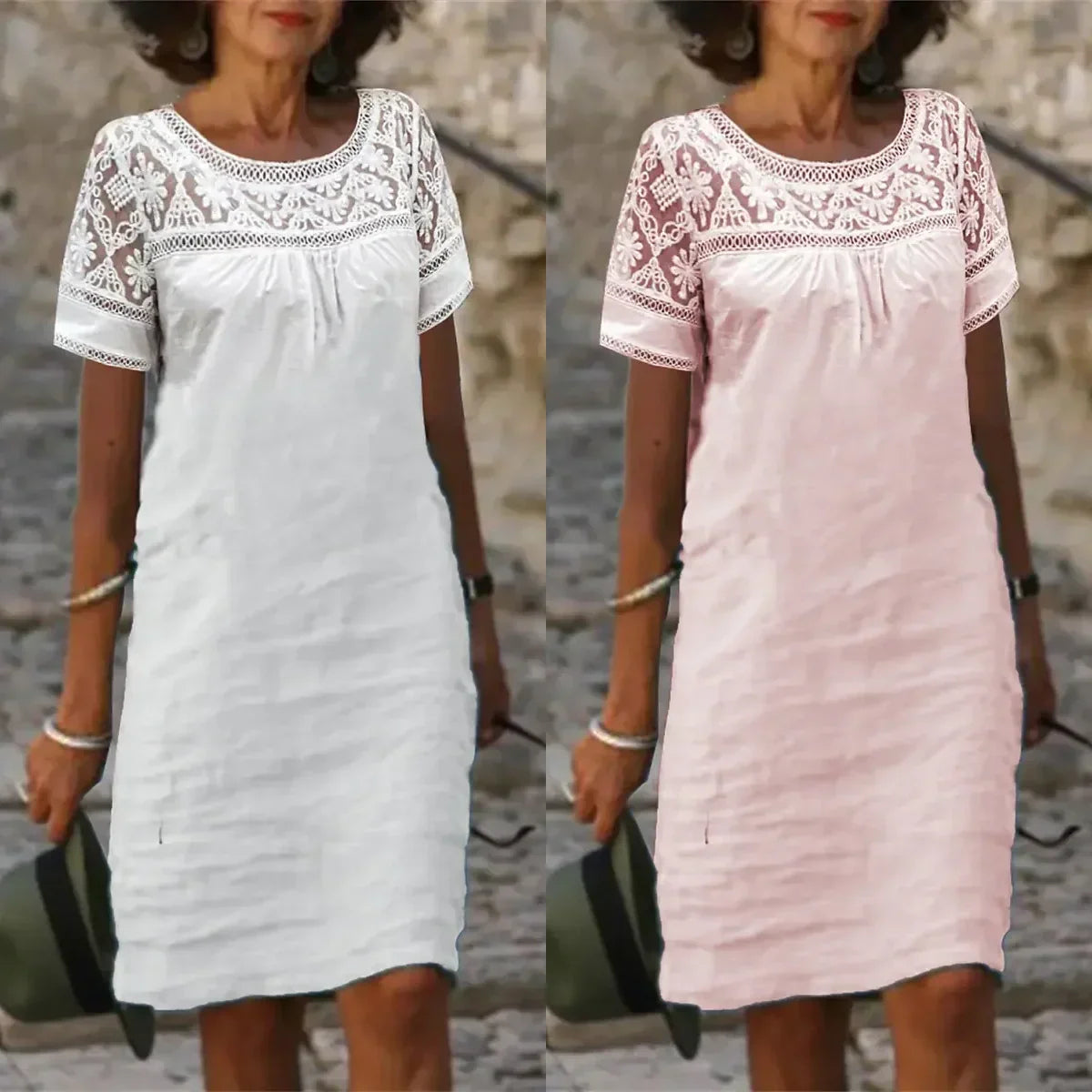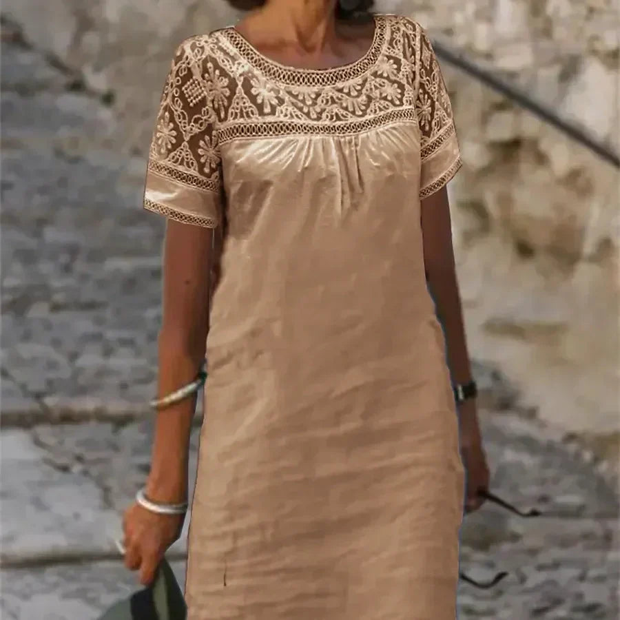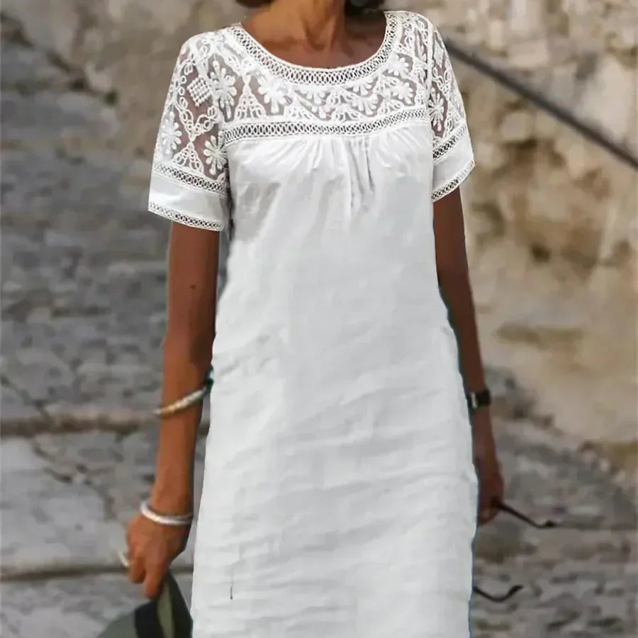 LACE PATCHWORK DETAIL: Delicate lace patchwork enhances this dress, adding timeless elegance and a feminine touch that elevates any casual outfit with effortless style.